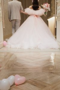 お色直し入場ではベビーピンクのドレスでご登場