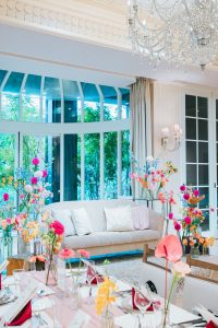 披露宴会場はおふたりらしいお色味のお花やクロス、ナフキンで